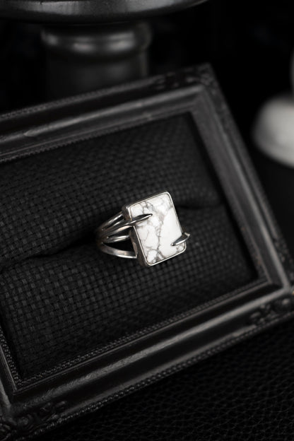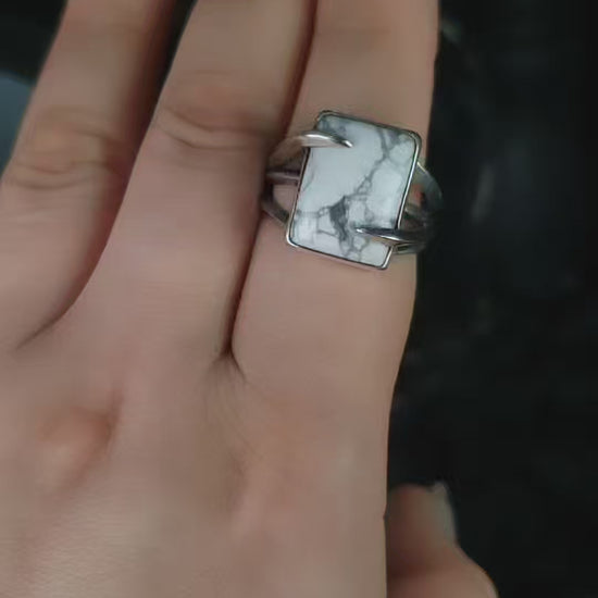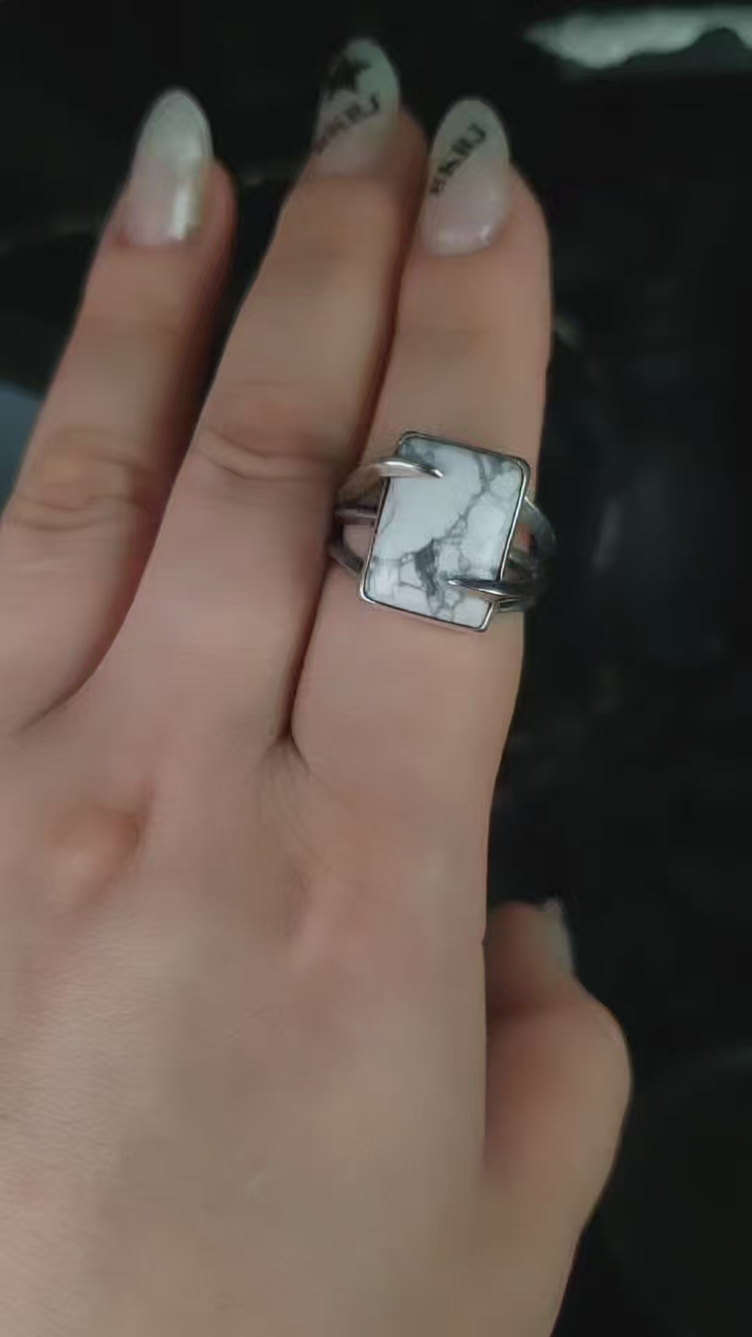 A calm elegance captured in stone — this one-of-a-kind handmade silver ring features a rectangular Howlite, known for its marble-like veining and soothing energy. The bold yet minimalist frame design highlights the stone's natural beauty while offering a modern, sculptural feel. A perfect piece for those who love subtle strength and timeless simplicity.