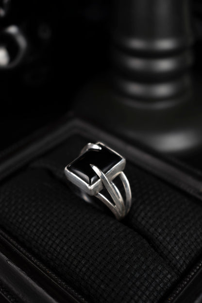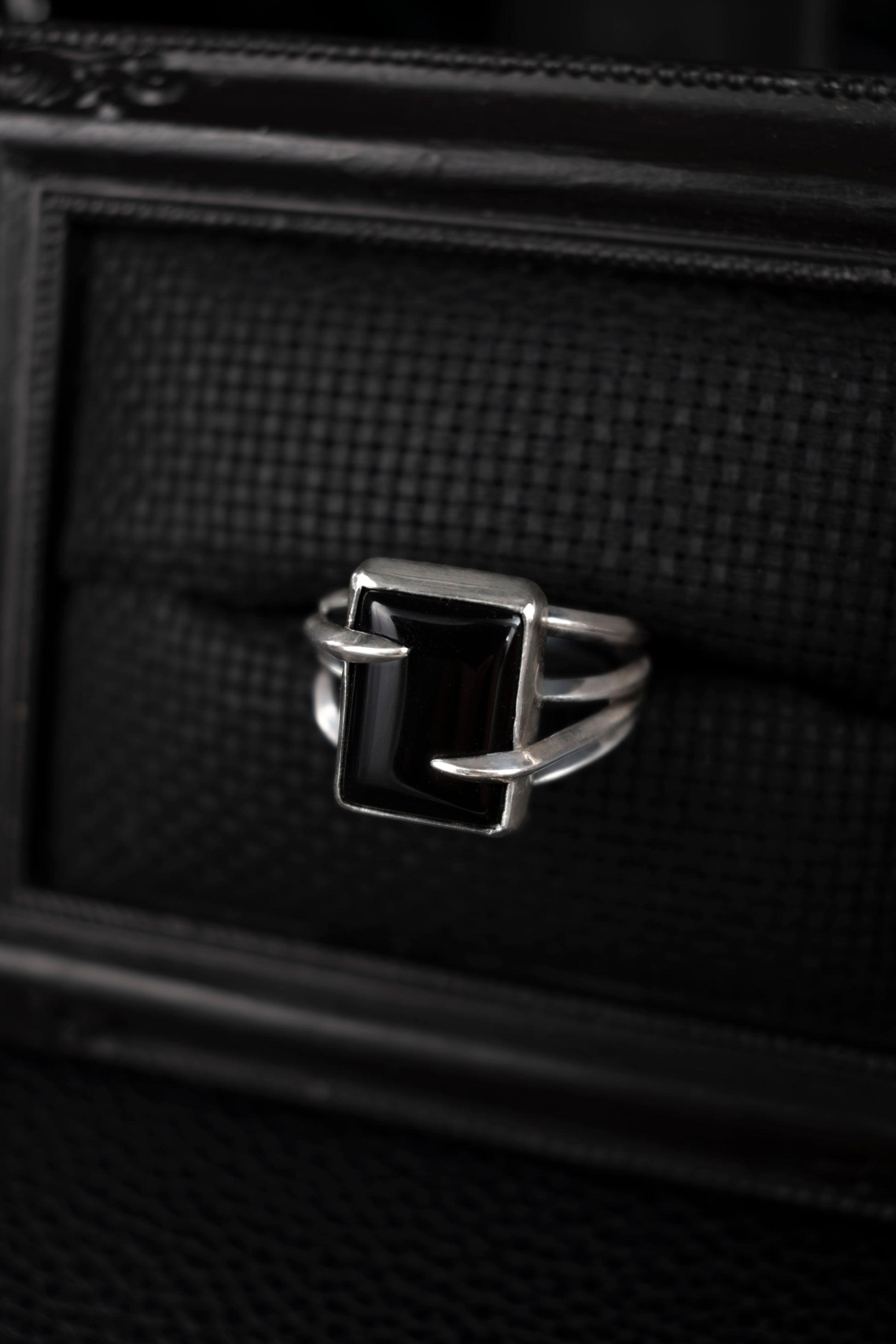 A bold statement piece featuring a rectangular black onyx set in a clean, handcrafted sterling silver frame. The split band design adds a modern edge while emphasizing the striking contrast between dark stone and bright silver. One-of-a-kind and timeless.