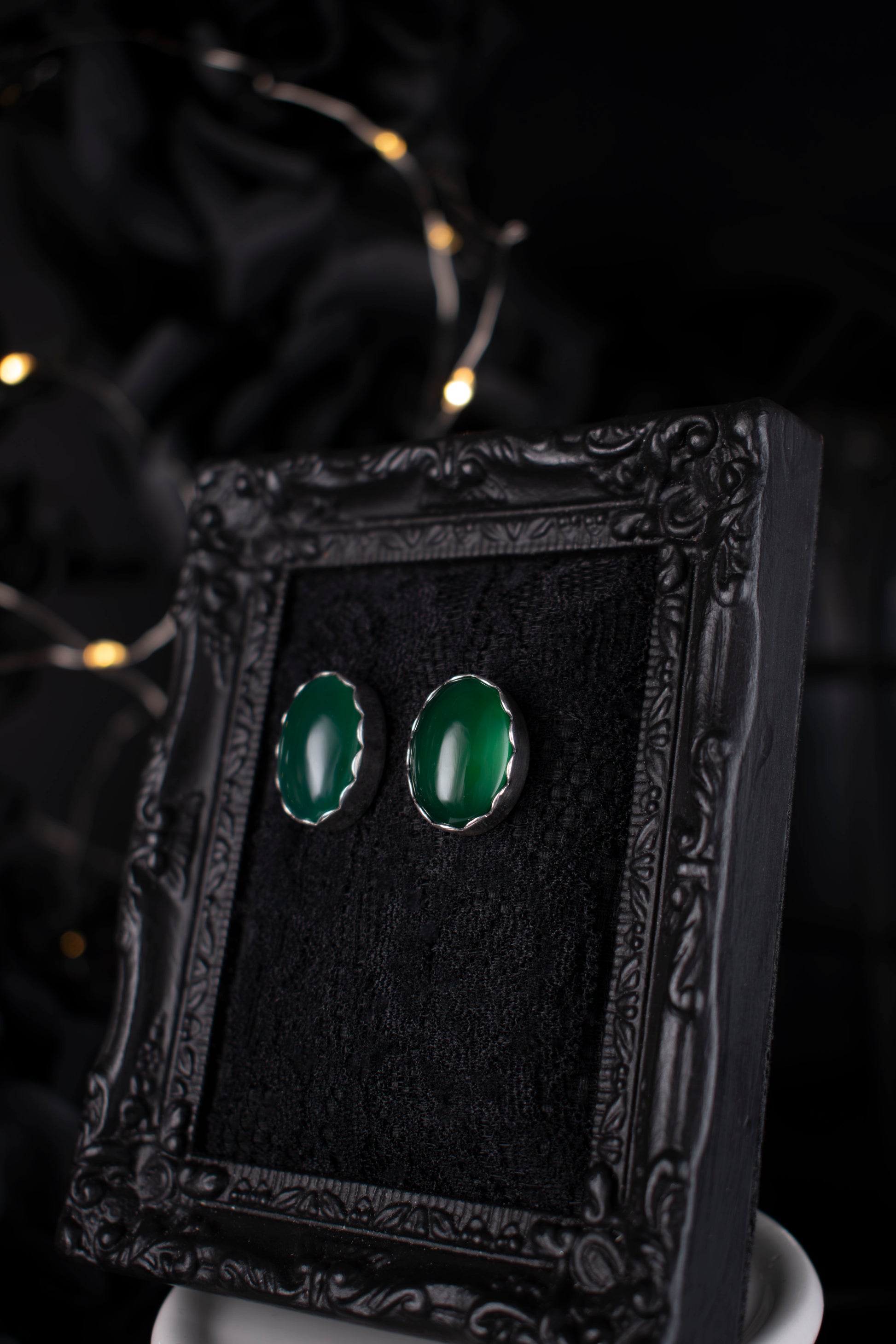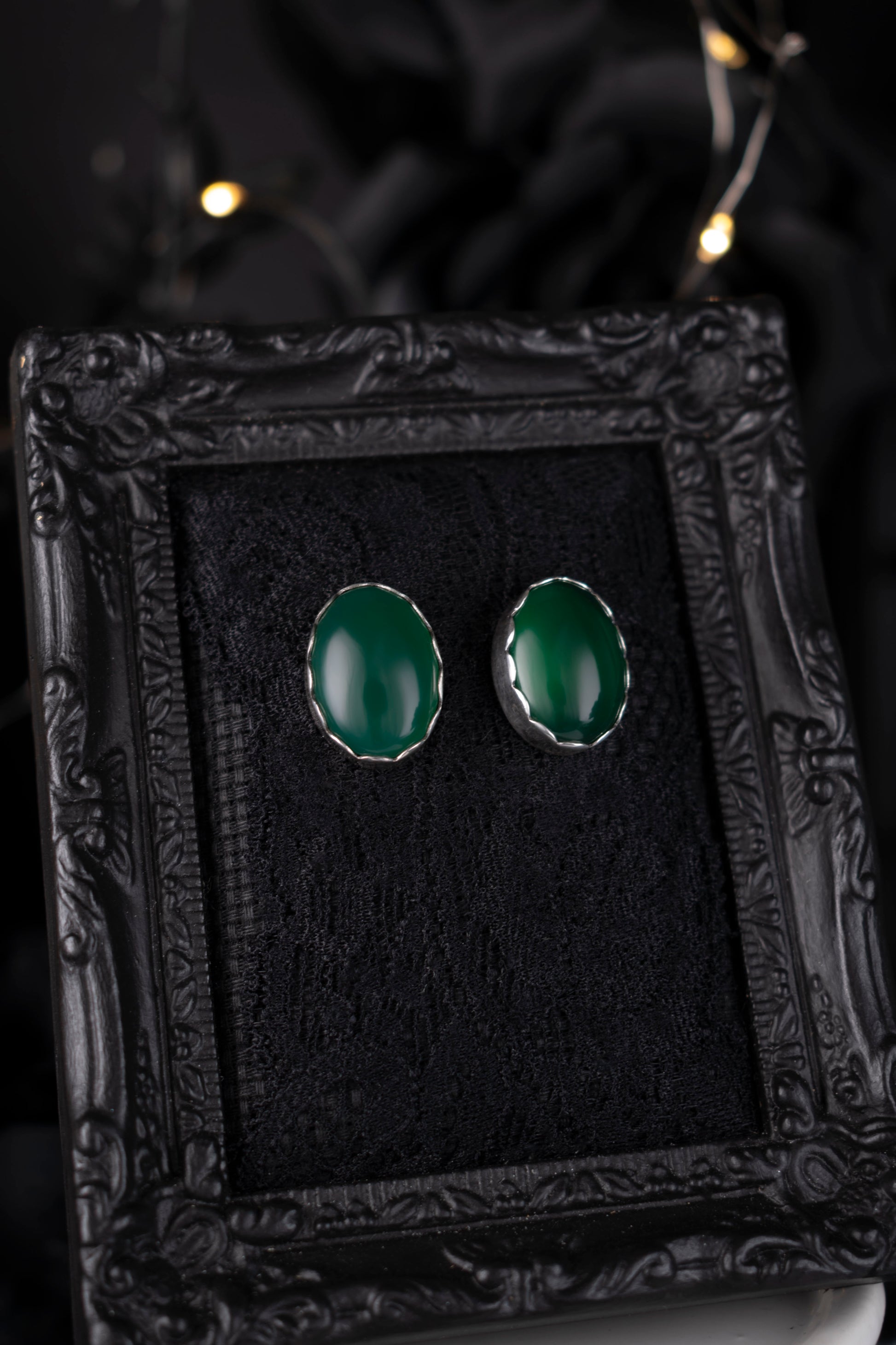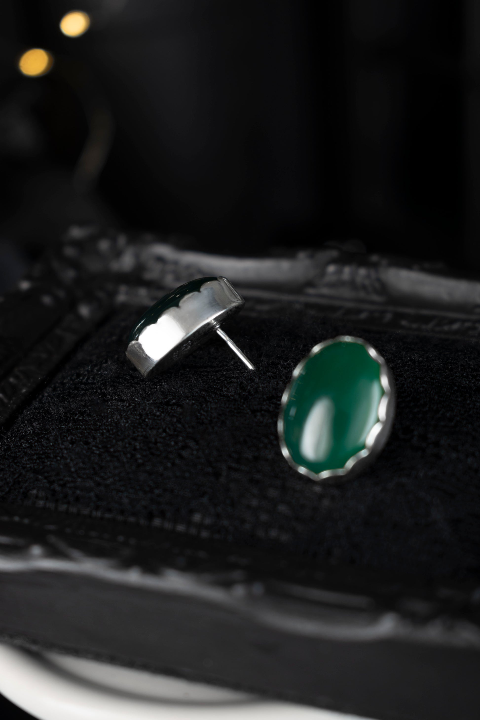 EKRJ1113 Handmade Oval Green Jade Studs Silver Earrings