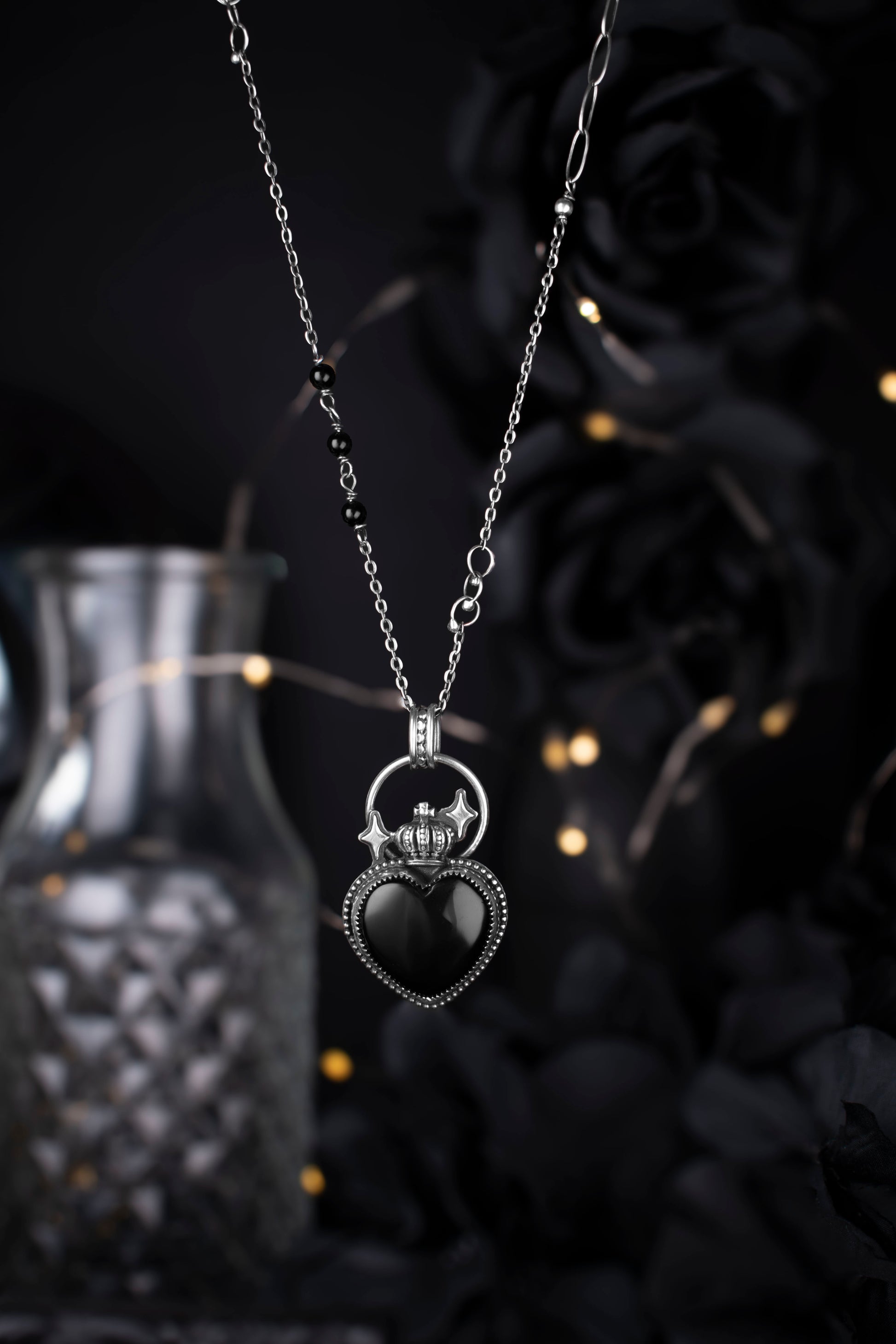 EKRJ1131 The Enchanted Noir Heart: One-of-a-Kind Sterling Silver & Black Onyx Crowned Necklace
