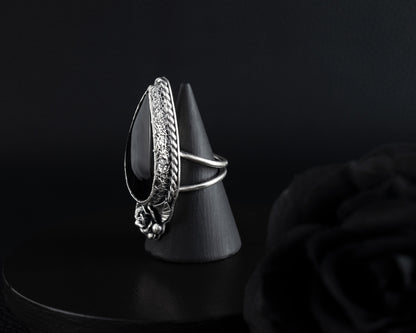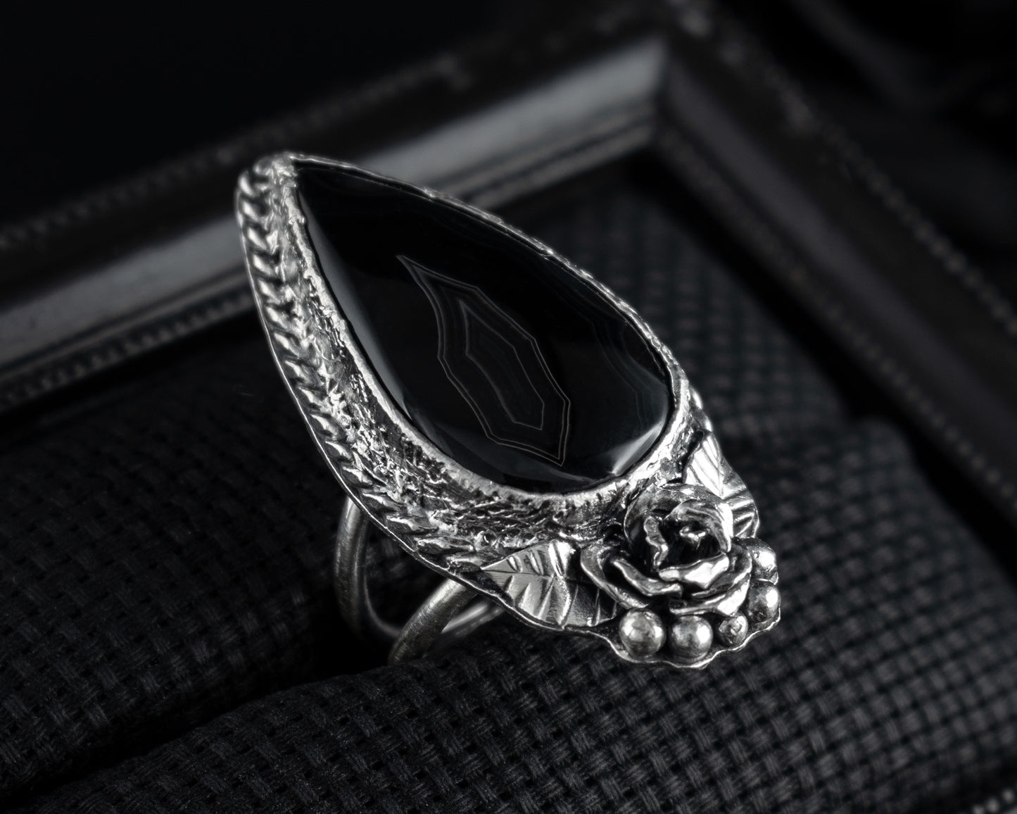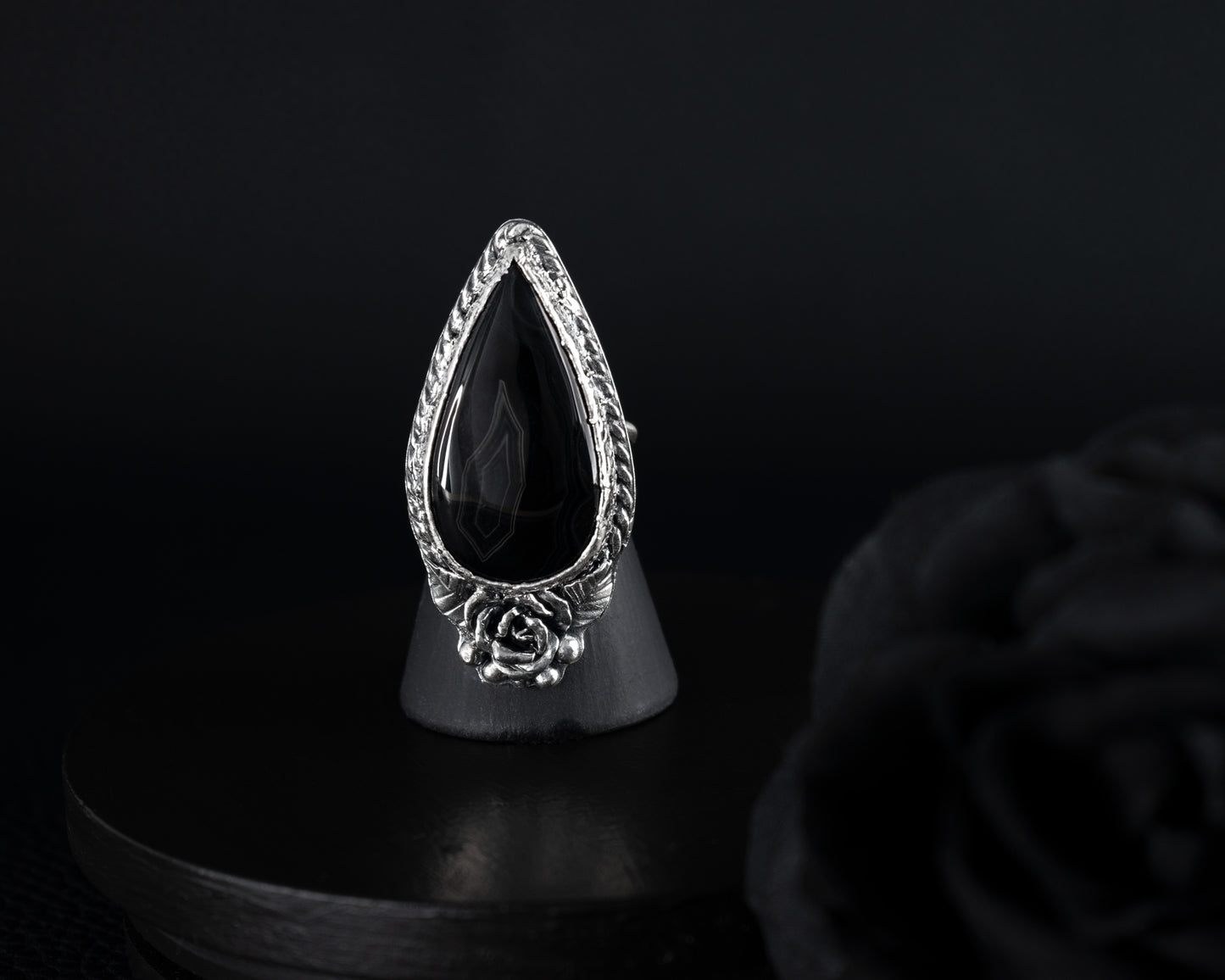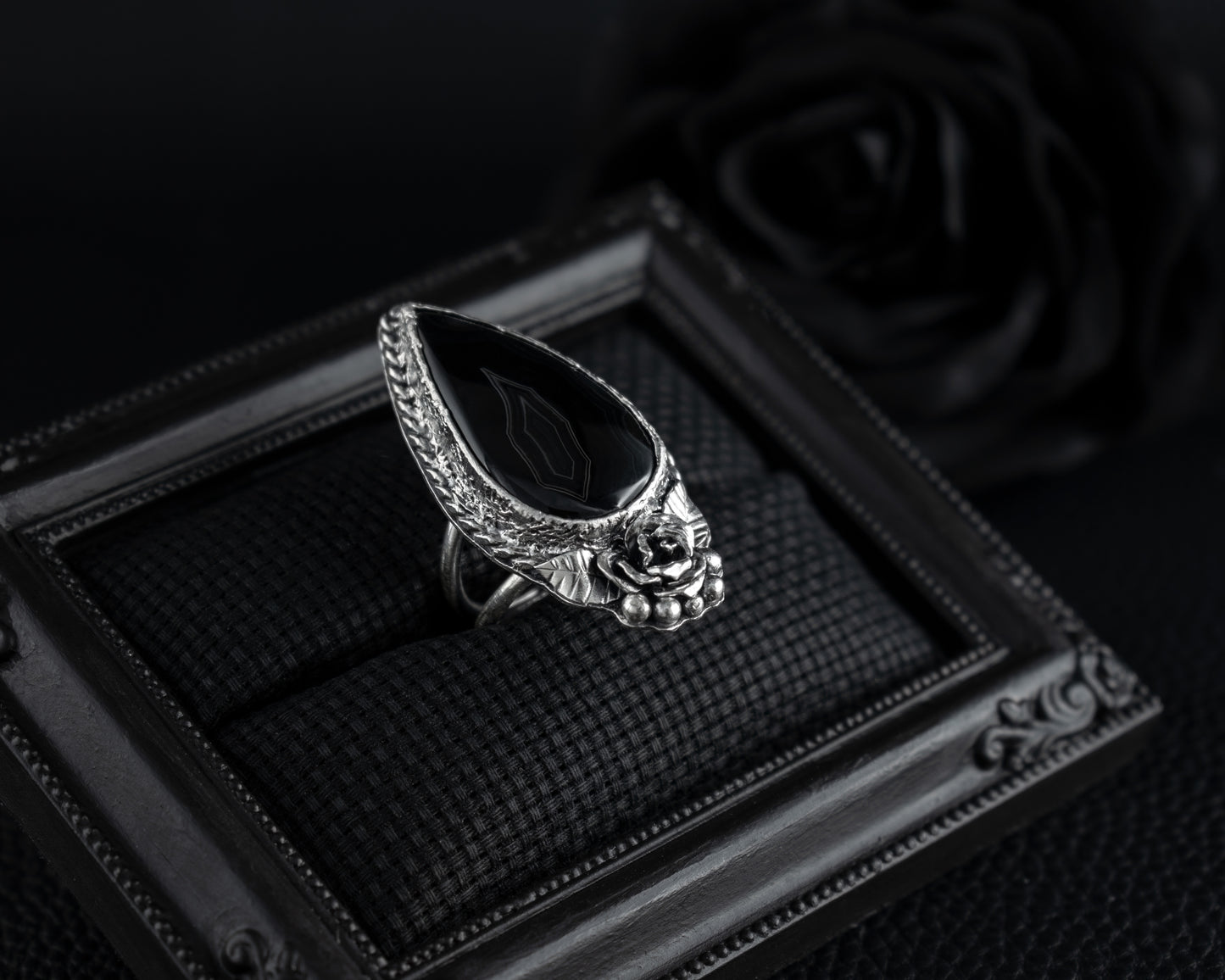 This statement jewelry piece exudes magical vibes and mysterious energy, making it the perfect accessory to elevate any outfit. The intricate silver rose and leaves detailing adds a touch of elegance and sophistication to this already exquisite design. Our Black Onyx Rose and Leaves Silver Ring is a perfect representation of the fine jewelry quality and style that Ottawa jewelry is known for. Shop now for a truly unique and stylish jewelry gift that is sure to impress.