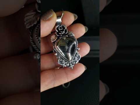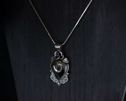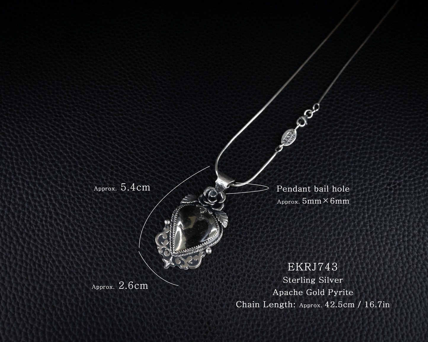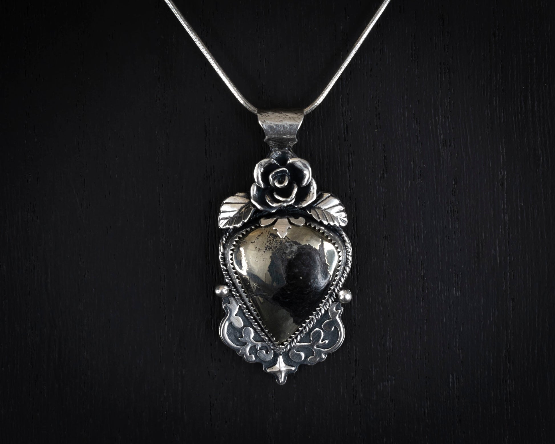 This handmade, one-of-a-kind necklace is a true work of art crafted with EKRJ's signature roses and antique patterns. Made with Sterling Silver and adorned with a beautiful Apache Gold Pyrite heart, this necklace is the perfect gift for Valentine's Day or any special occasion. Elevate your style with this unique and stylish piece of jewelry, proudly made in Ottawa, Canada.