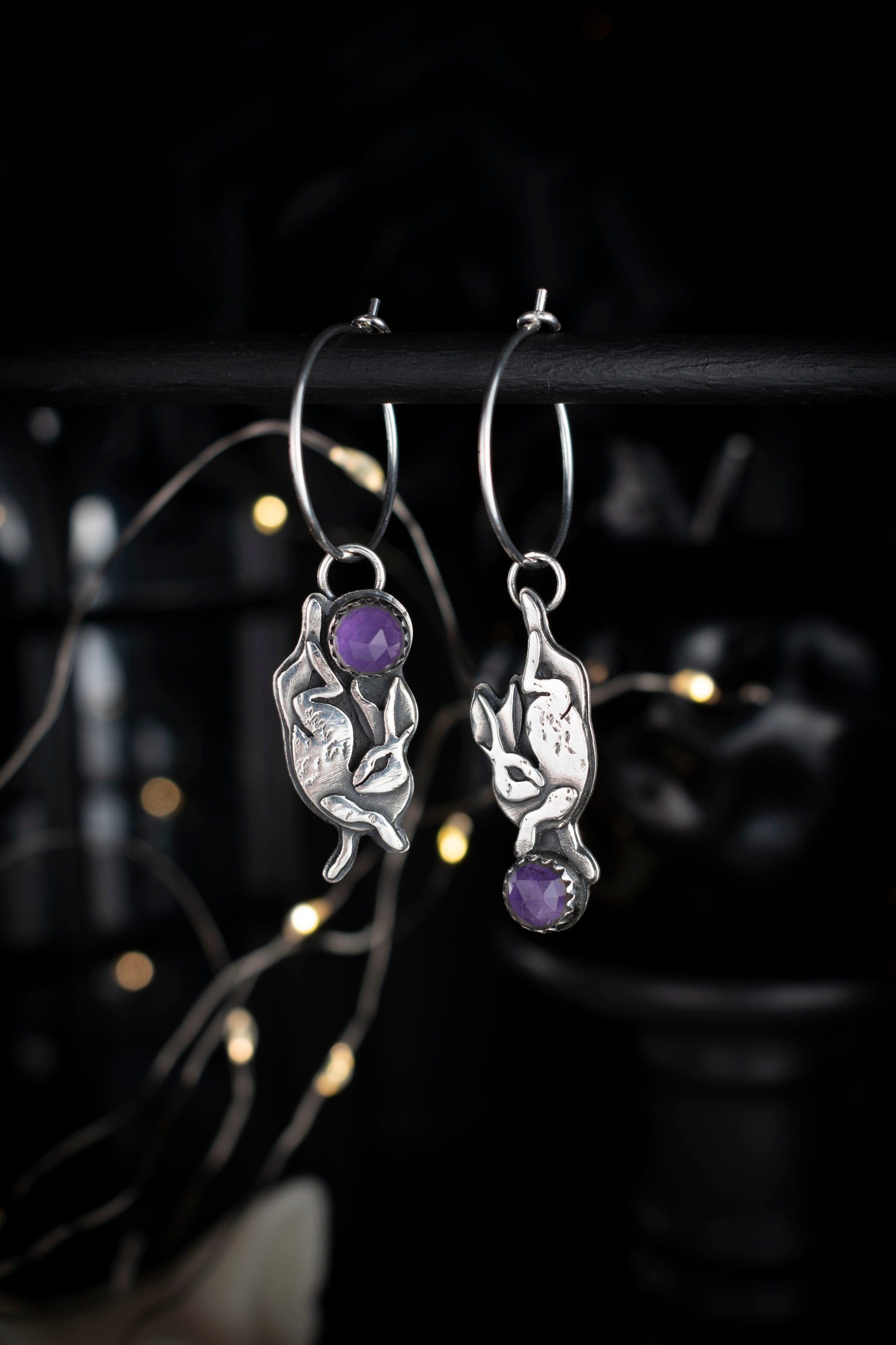 EKRJ978 Hares & Amethyst One-of-a-kind Handmade Silver Hoop Earrings