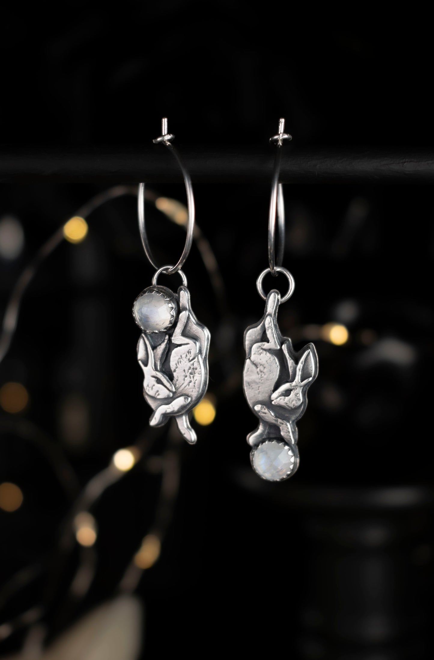 EKRJ979 Hares & Moonstone One-of-a-kind Handmade Silver Hoop Earrings